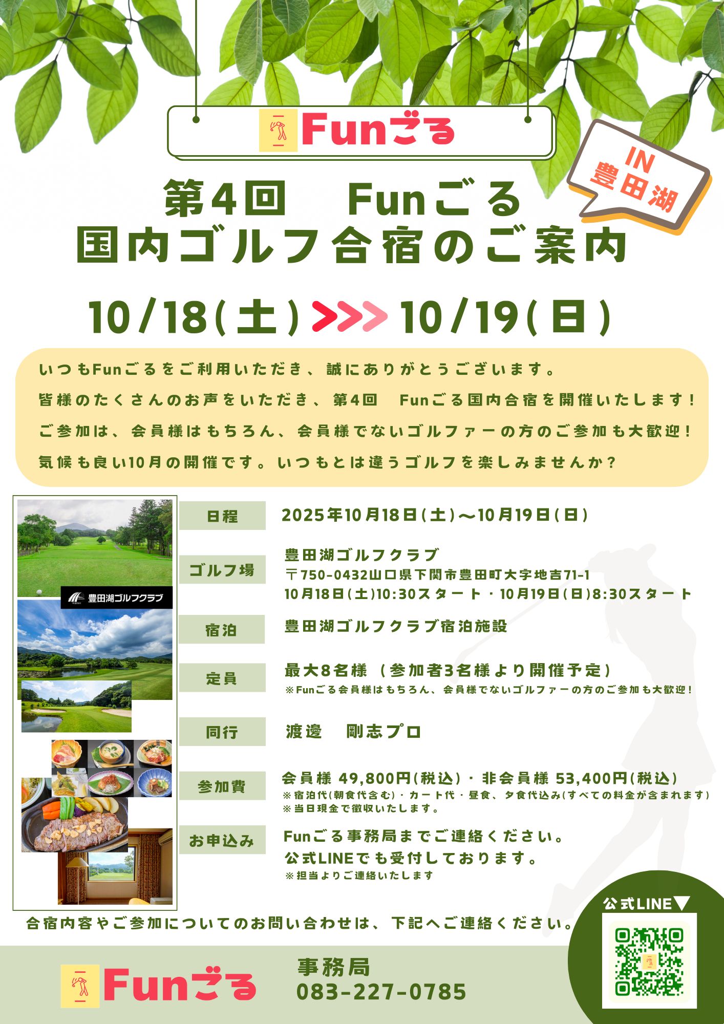 2025年 第4回国内合宿のご案内 2025.08.06 HOME ブログ スタッフブログ 2025年 第4回国内合宿のご案内 Tweet 2025年も第4回国内合宿を開催決定!! 今回は、Funごる所属のプロゴルファー、渡邊剛志プロが同行!! レッスンもあって、普段とは違って夕食をわいわいみなさんで楽しく♪ ぜひご参加お待ちしております( *´艸`) 山口県でゴルフはじめるなら、Funごる!! 3周年Funごる記念コンペ先行予約スタート!!