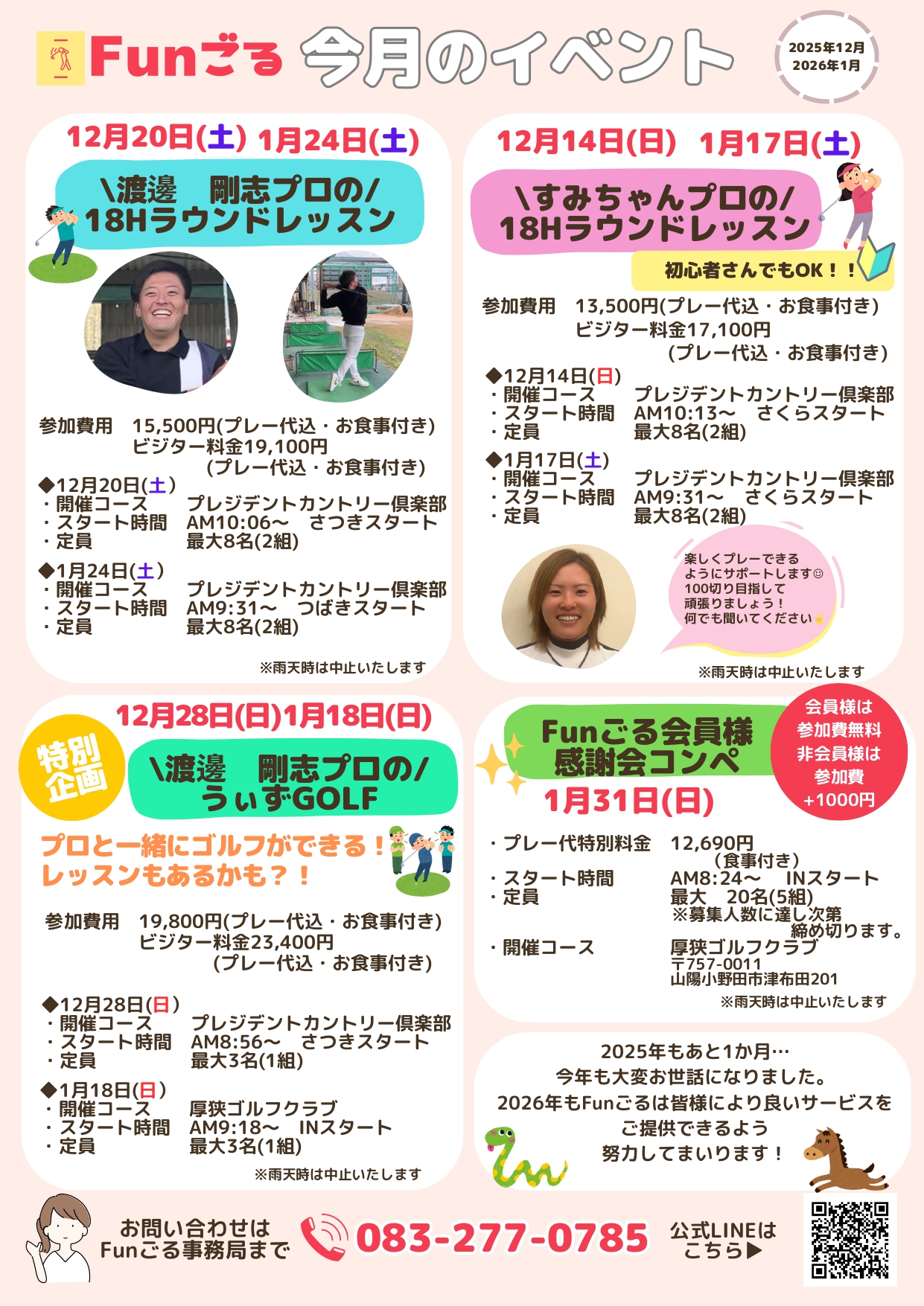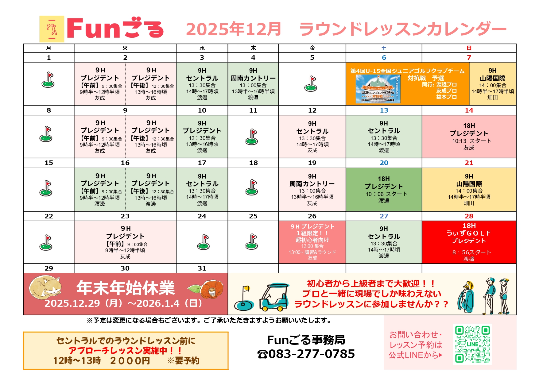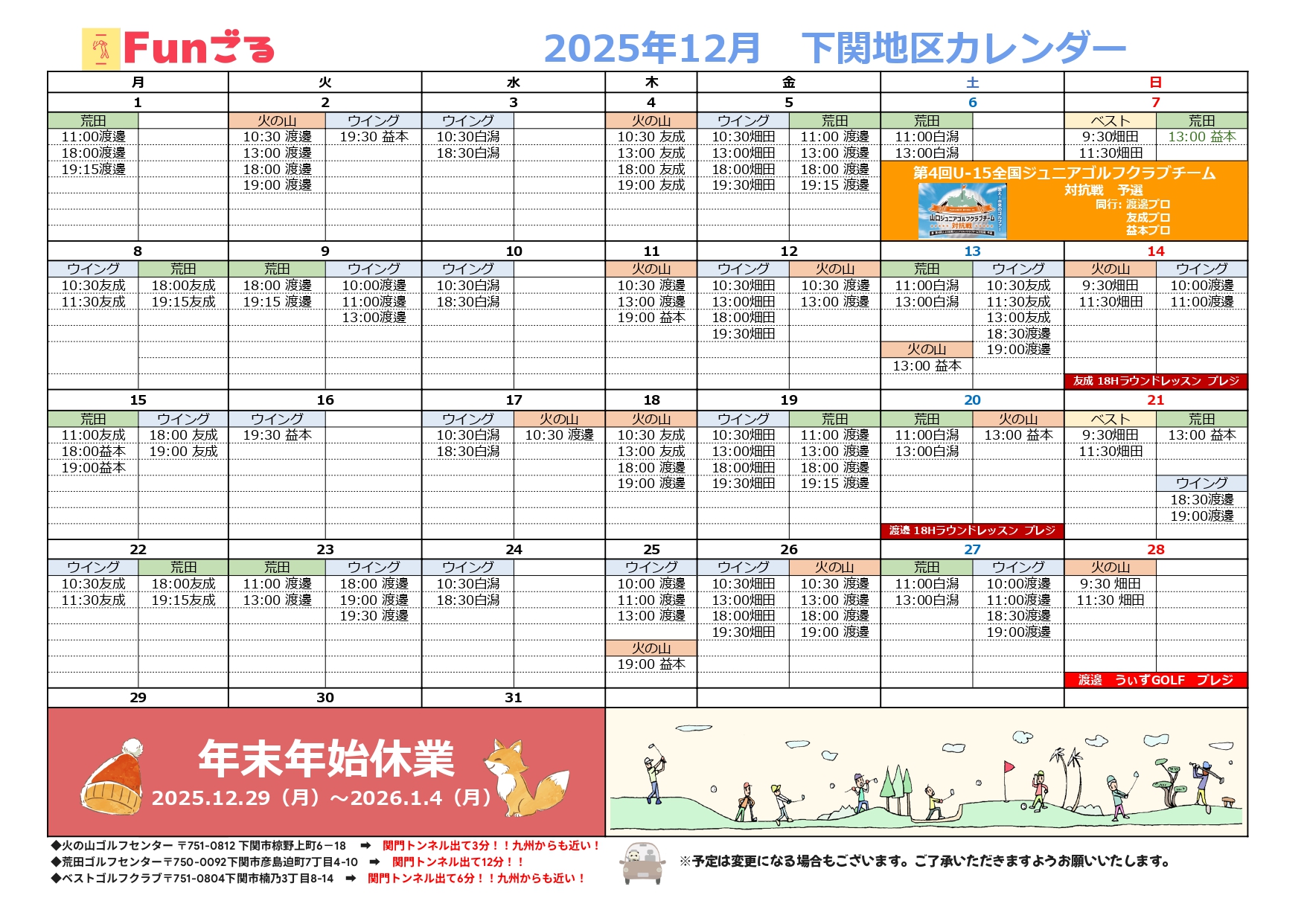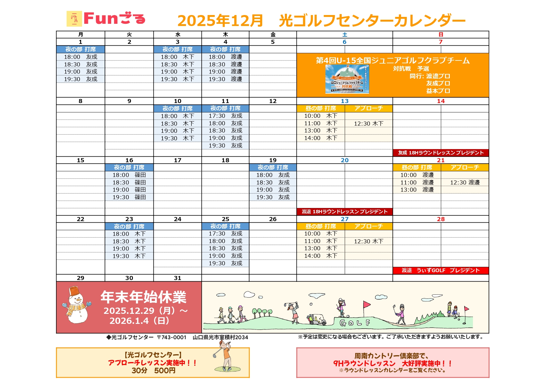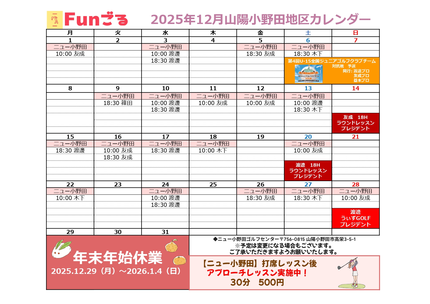 2025年12月スケジュール 2025.11.18 HOME Schedule 2025年12月スケジュール Tweet 【下関地区】 【ニュー小野田ゴルフセンター】 【光ゴルフセンター】 【ラウンドレッスン】 【イベント】 2025年11月スケジュール 2026年1月スケジュール 2026.01.02 2026年1月スケジュール 2025.11.18 2025年12月スケジュール 2025.10.27 2025年11月スケジュール 2025.09.26 2025年10月スケジュール 2025.08.26 2025年9月スケジュール 2025.07.25 2025年8月スケジュール 2025.06.26 2025年7月スケジュール 2025.05.23 2025年6月スケジュール 2025.04.24 2025年5月スケジュール 2025.03.26 2025年4月スケジュール