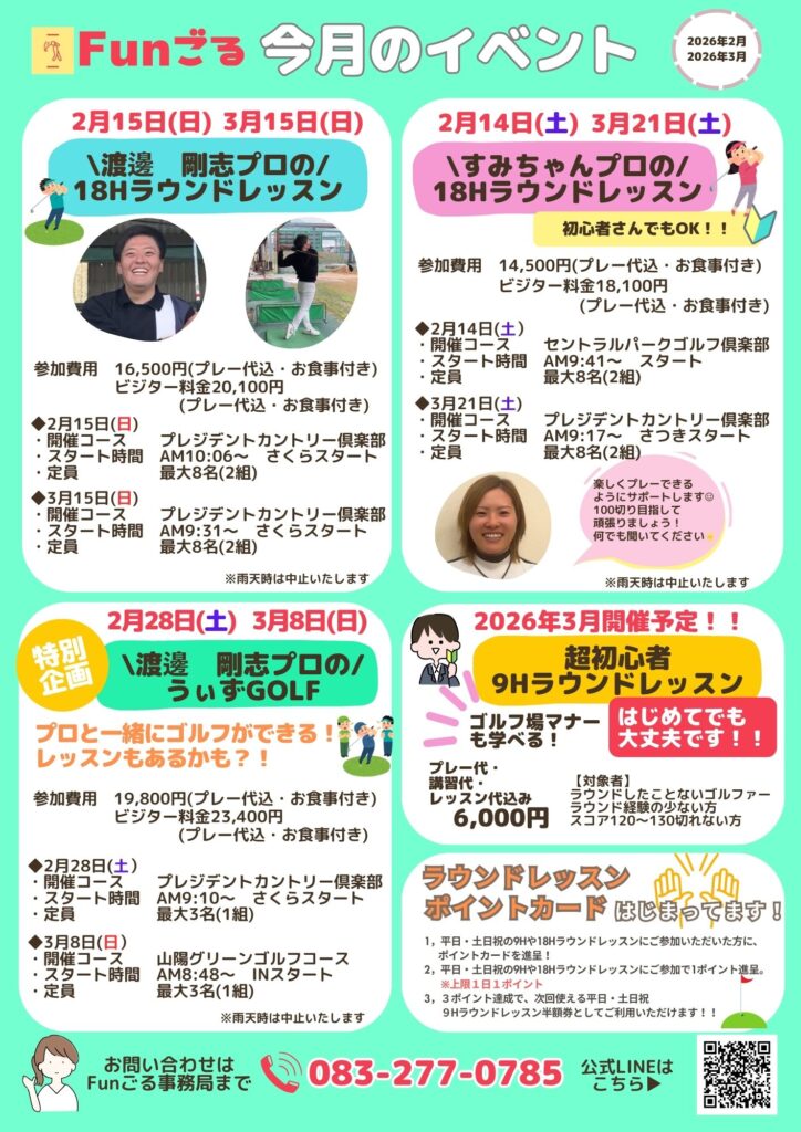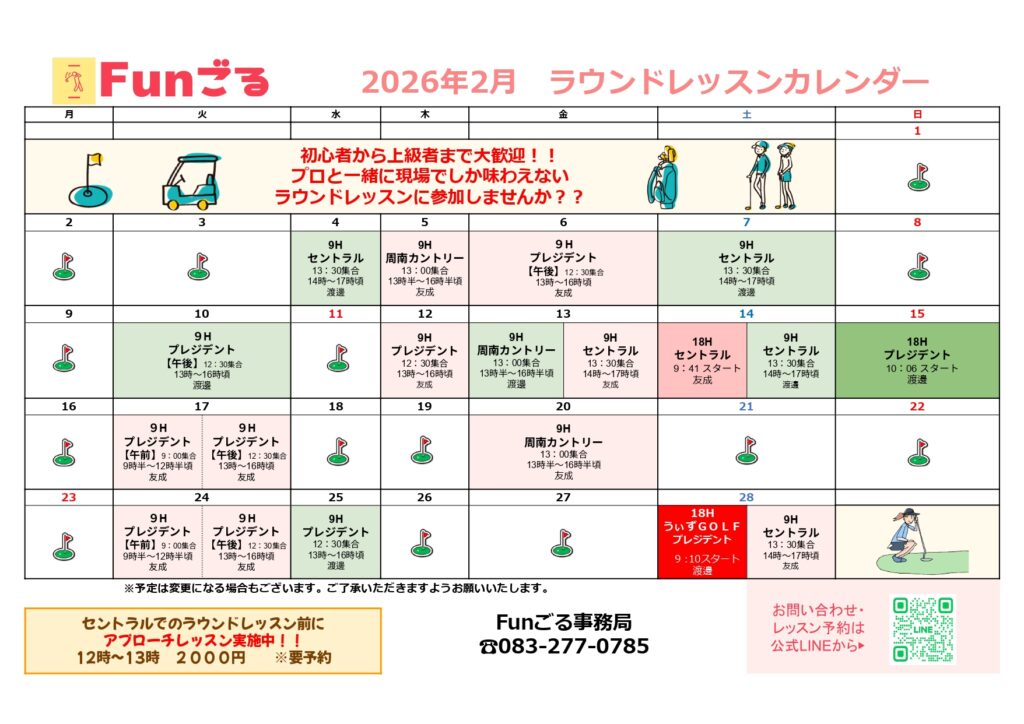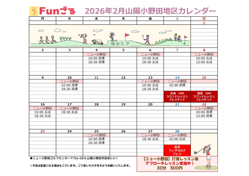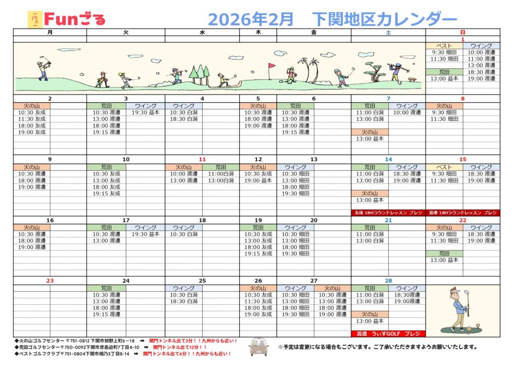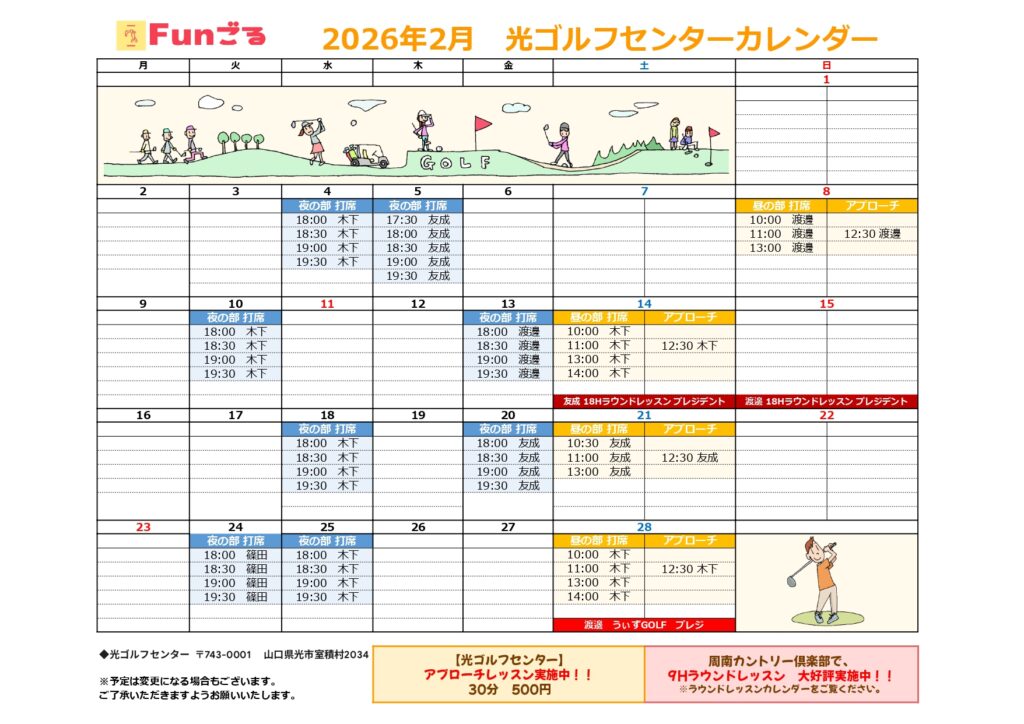 2026年2月スケジュール 2026.01.23 HOME Schedule 2026年2月スケジュール Tweet 1月スケジュール 【下関地区】 【ニュー小野田ゴルフセンター】 【光ゴルフセンター】 【ラウンドレッスン】 【イベント】 【お知らせ】 2026年1月スケジュール 2026.01.23 2026年2月スケジュール 2026.01.02 2026年1月スケジュール 2025.11.18 2025年12月スケジュール 2025.10.27 2025年11月スケジュール 2025.09.26 2025年10月スケジュール 2025.08.26 2025年9月スケジュール 2025.07.25 2025年8月スケジュール 2025.06.26 2025年7月スケジュール 2025.05.23 2025年6月スケジュール 2025.04.24 2025年5月スケジュール